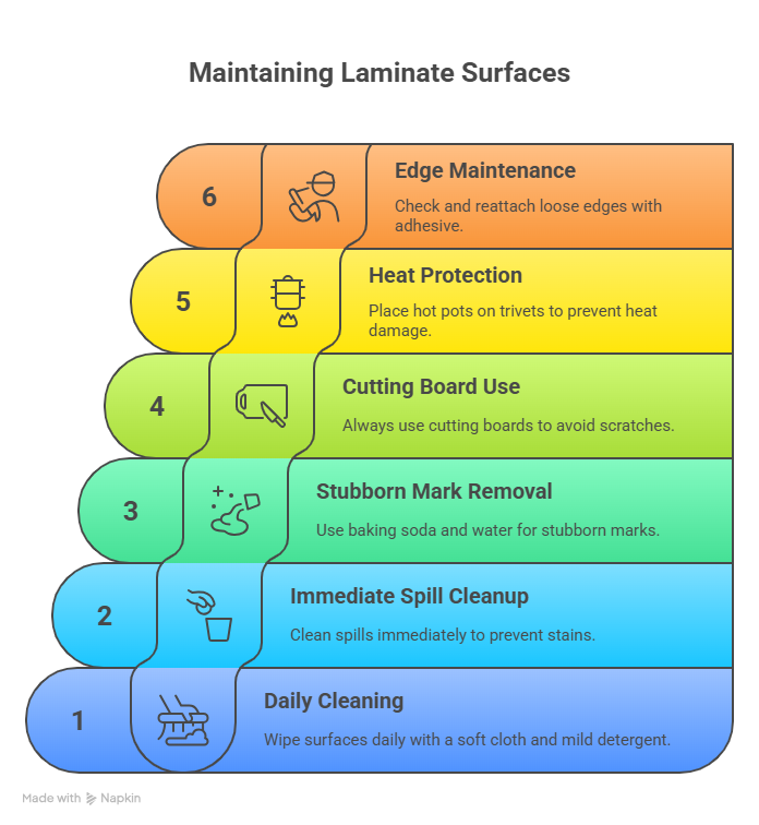 To keep your laminate kitchen benchtop looking its best, regular maintenance and care are essential. Start by wiping it down daily with a soft cloth and a mild detergent solution. Avoid abrasive cleaners that can scratch the surface. If a spill occurs, clean it immediately to prevent stains. For stubborn marks, use a mixture of baking soda and water, applying gently with a non-abrasive sponge.