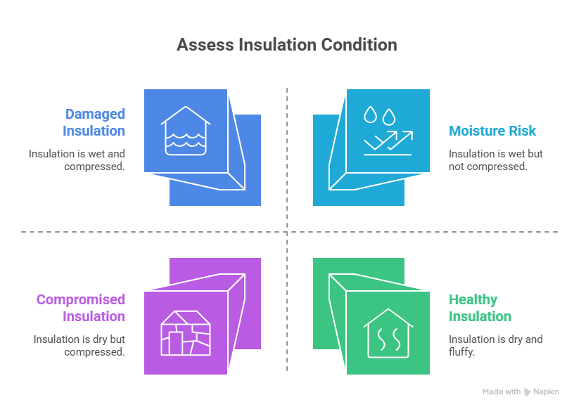 Healthy insulation should be dry, uniform, and fluffy. After a harsh winter, wet or compressed patches signal trouble. Moisture-saturated insulation loses its thermal effectiveness, and mold can begin to grow if wet materials are not dry within 24 to 48 hours of exposure to water, according to the U.S. Environmental Protection Agency.