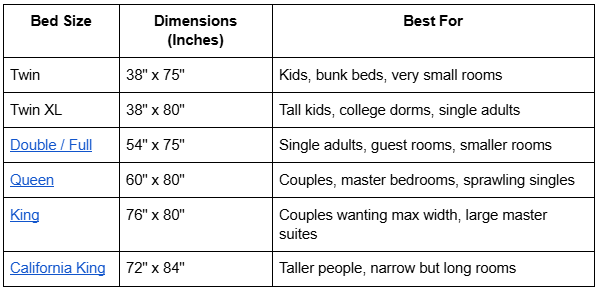 Bed names sound simple, but the differences in width and length really change how a room feels. The mattress sizes you choose dictate your comfort level. Use this table as a quick cheat sheet while you measure your space.