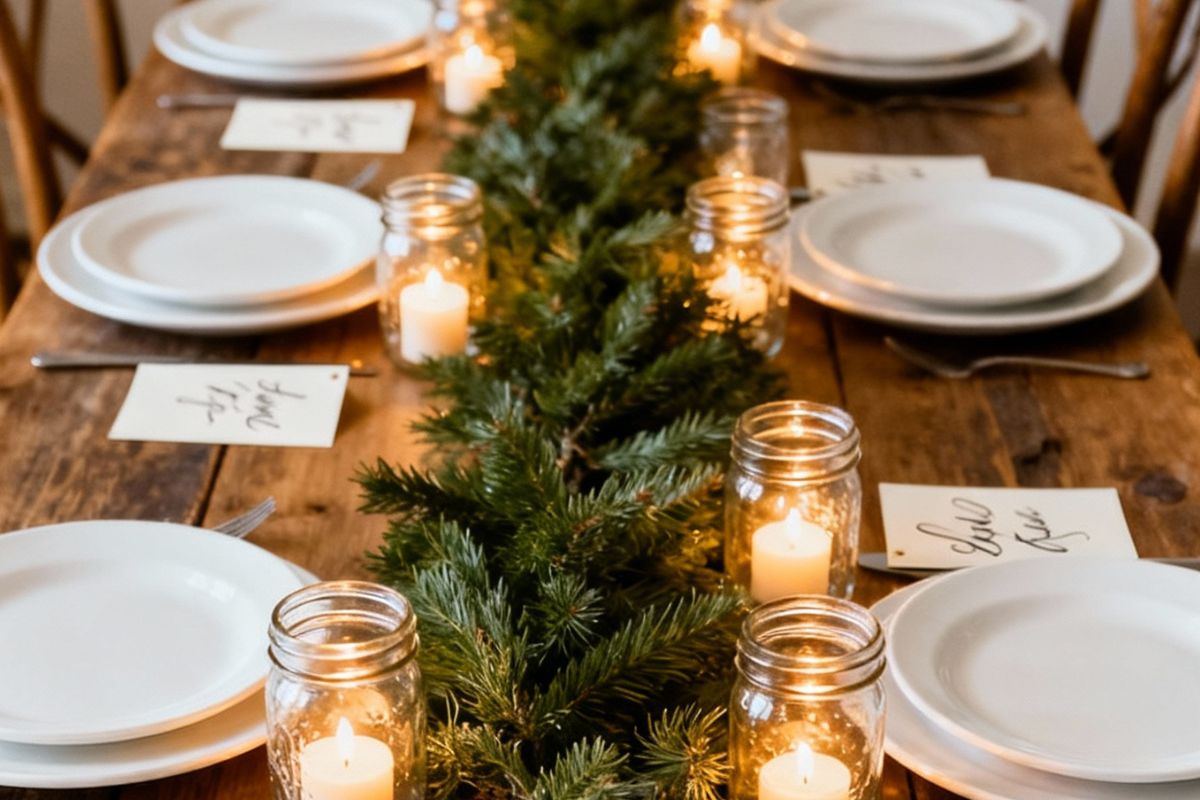 Add texture with a linen runner or reclaimed board to ground the display. Finish with slim velvet ribbon tails, understated bells, and a faint woodsy scent via cedar essential oil.