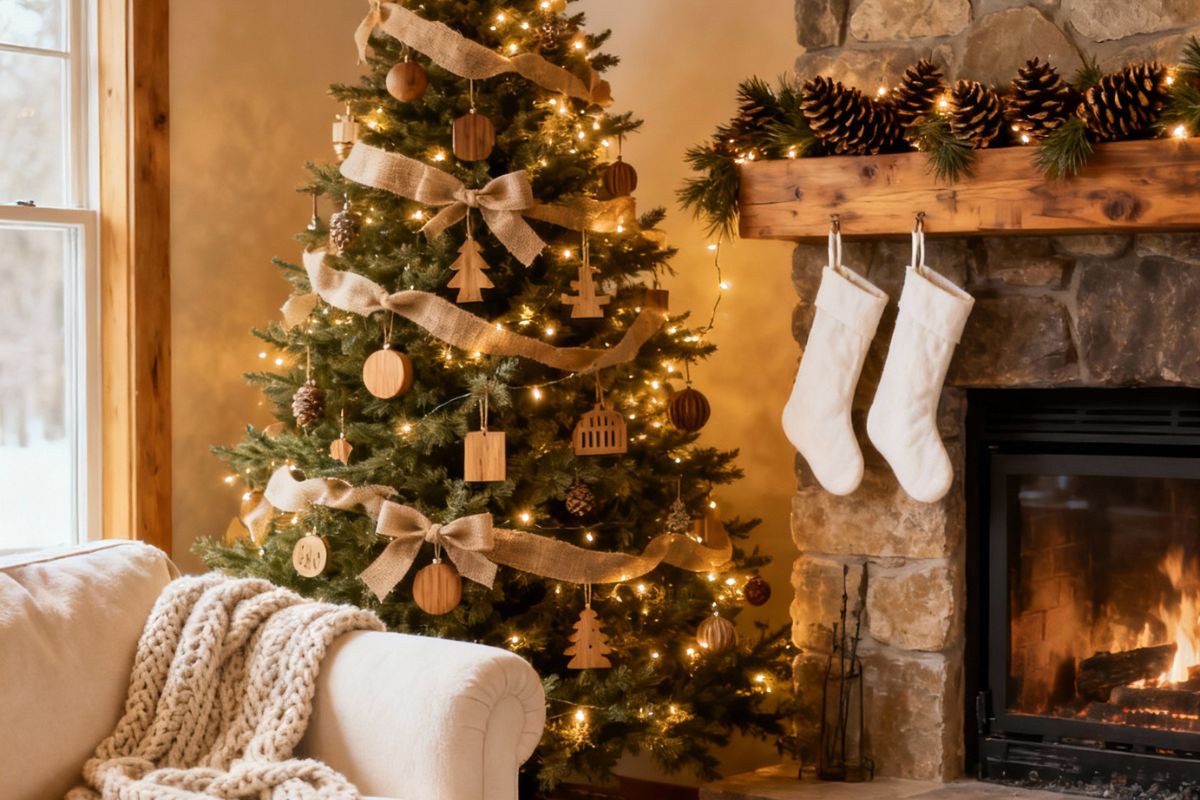 Create a cozy farmhouse Christmas with a neutral palette: creamy whites, warm greige, and weathered wood. Layer flannel, linen, and chunky knits; mix buffalo check with smaller plaids. Drape cedar, juniper, and eucalyptus garlands, add pinecones, dried oranges, and cinnamon. Decorate with linen or paper ornaments, wood beads, kraft tags, and twine bows. Soften with micro-LEDs, matte black or galvanized lanterns, and mason jars. Finish with a cedar wreath and natural-fiber doormat at the entry—there’s more to make it feel complete.