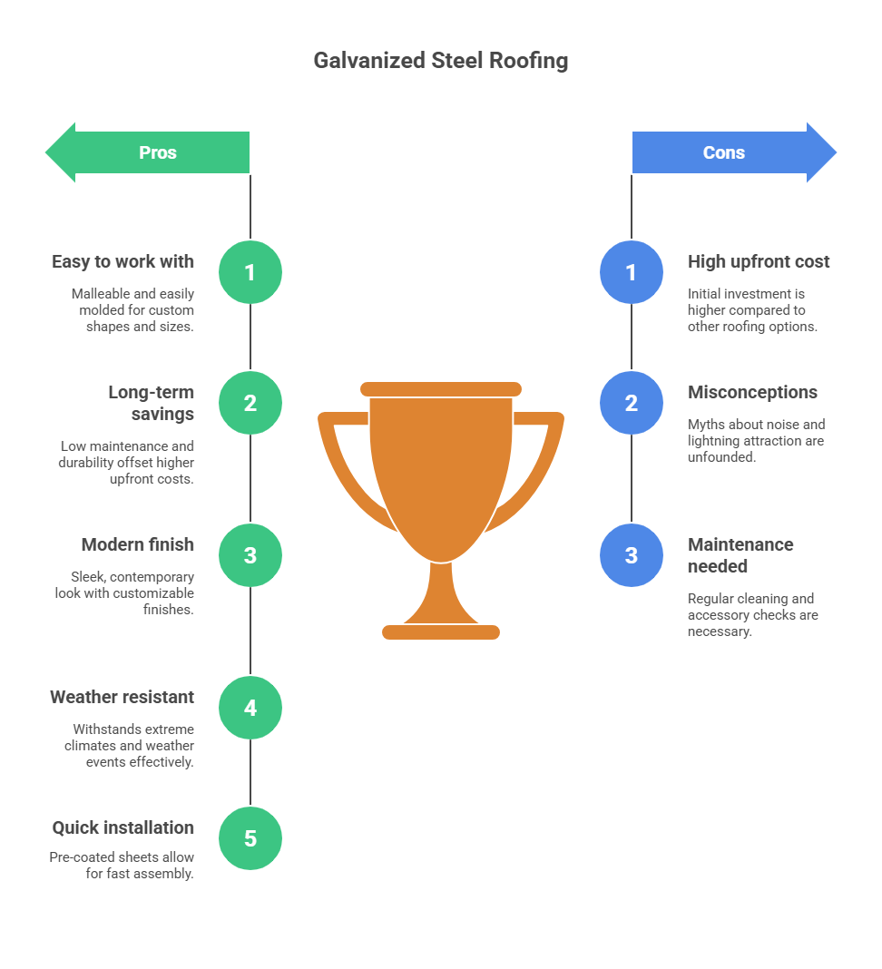 It has proven advantages when it comes to return on investment, although the upfront costs may be on the higher side. However, in the long run, galvanized steel roofs pay for themselves by way of low maintenance, durability and eco-friendliness.