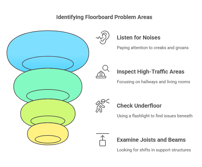 - Identify squeaky areas by walking on the floor and listening, focusing on high-traffic zones.