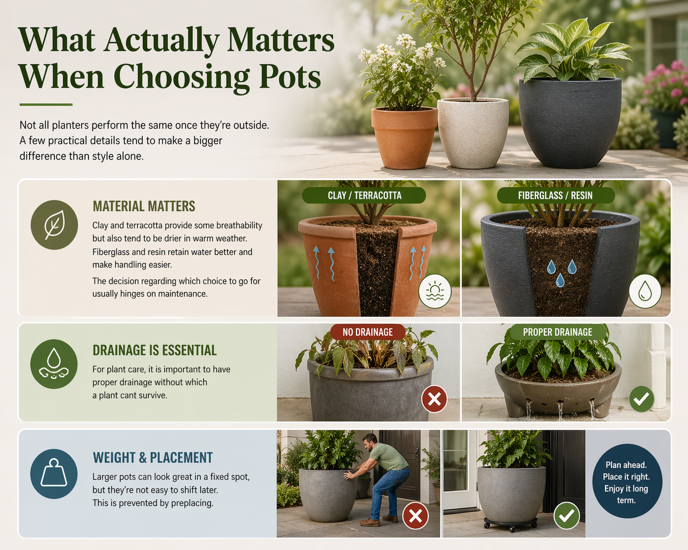 Not all pots perform the same once they’re placed outdoors. Style matters, but a few practical factors make a much bigger difference in how your plants do and how easy they are to take care of.