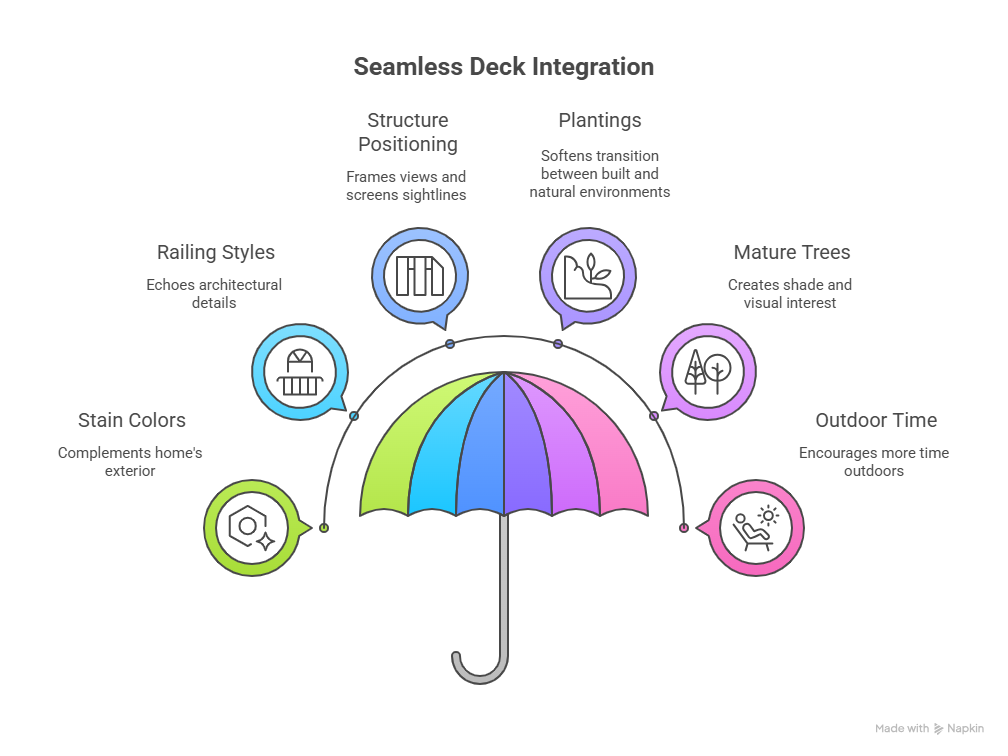 Integrating plantings softens the transition between built and natural environments. Perimeter planters or coordinated container gardens blur the line between deck and yard. Some projects incorporate existing mature trees through the deck structure, creating shade and visual interest that new construction can't replicate.