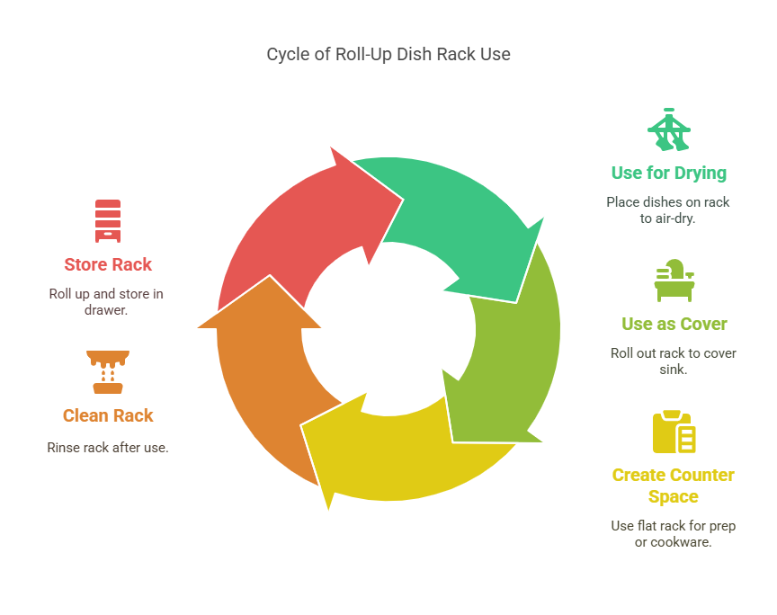 If you want a versatile solution for your kitchen sink, consider a roll-up dish drying rack that also serves as a cover. These racks are made of sturdy, food-safe silicone or stainless steel rods, letting you air-dry dishes or rinse produce over the sink. When you need extra counter space, simply roll the rack flat over the sink to create a temporary surface for prepping ingredients or setting down hot cookware.