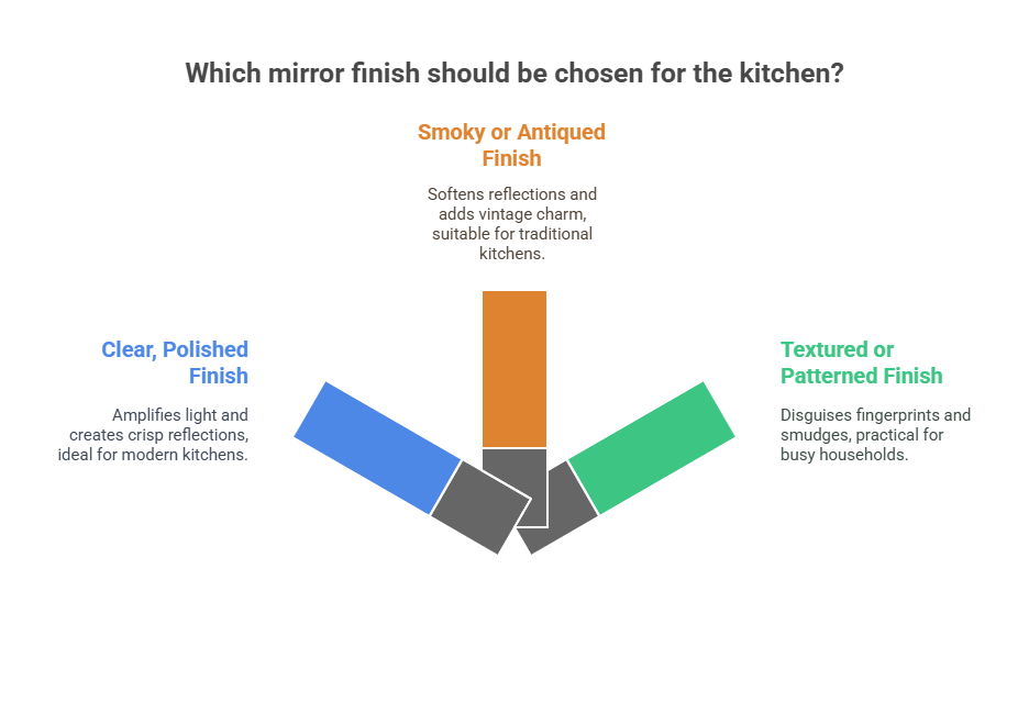 - Select clear, smoky, or antiqued mirror finishes to match your kitchen’s style and enhance visual interest.