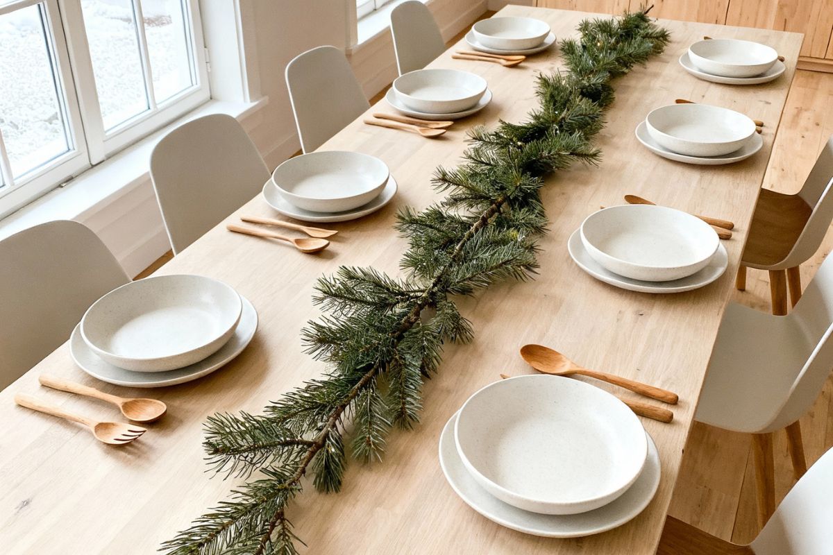 Keep the palette light—soft whites, pale wood, a touch of charcoal—so the space feels open. Add a woven mat and a single sprig of evergreen for quiet cheer.