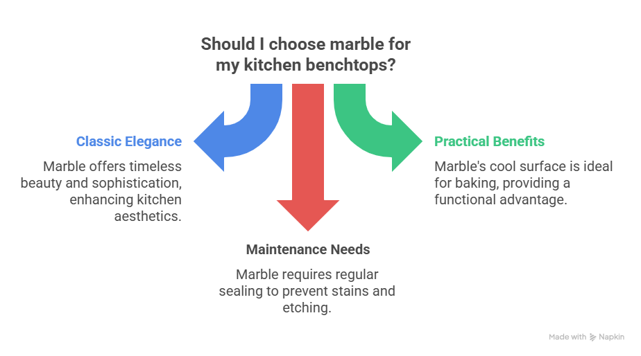 Marble benchtops are not just about beauty; they’re also practical. Ideal for baking enthusiasts, marble stays cool, providing the perfect surface for rolling dough. However, you’ll need to be mindful of its porous nature. Regular sealing is essential to prevent stains and etching from spills.