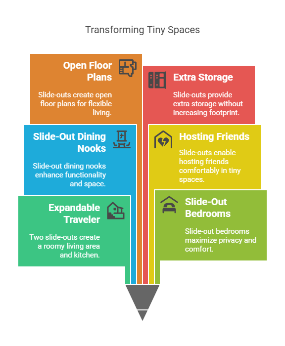 - Slide-outs in tiny houses expand living space without increasing the home's overall footprint.
