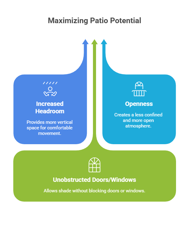 The biggest advantage of roof-mounted awnings is that they start higher up than wall-mounted options, which means you get way more usable vertical space underneath. This is huge when you're dealing with a small patio where every bit of headroom counts.