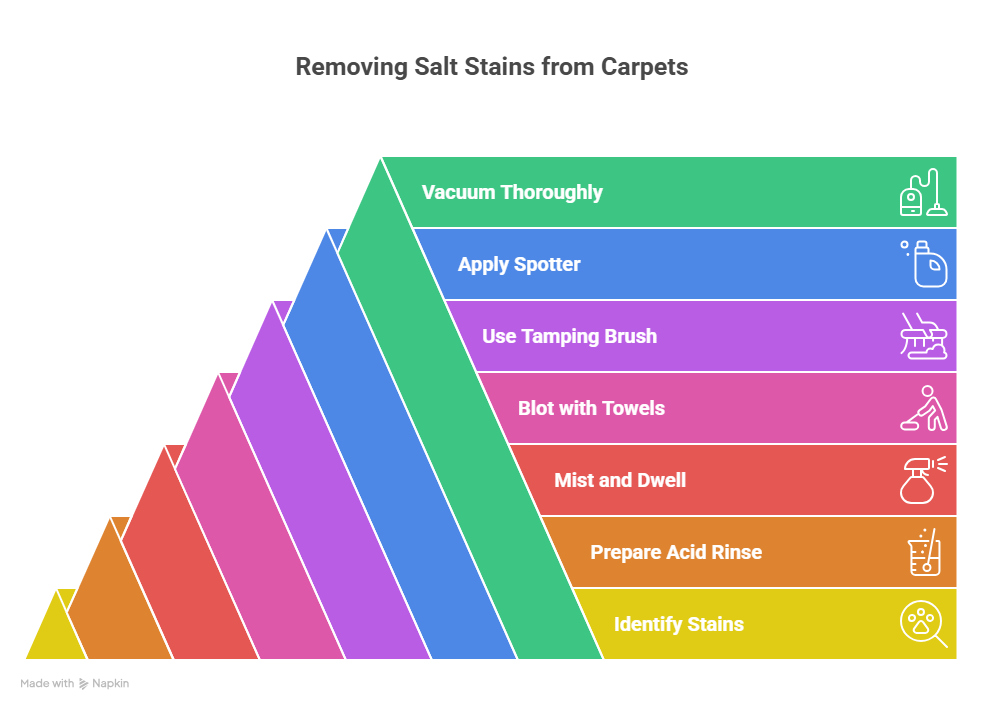 Because de-icing salts crystallize and wick upward as carpets dry, act within hours to prevent alkaline residue from etching fibers.