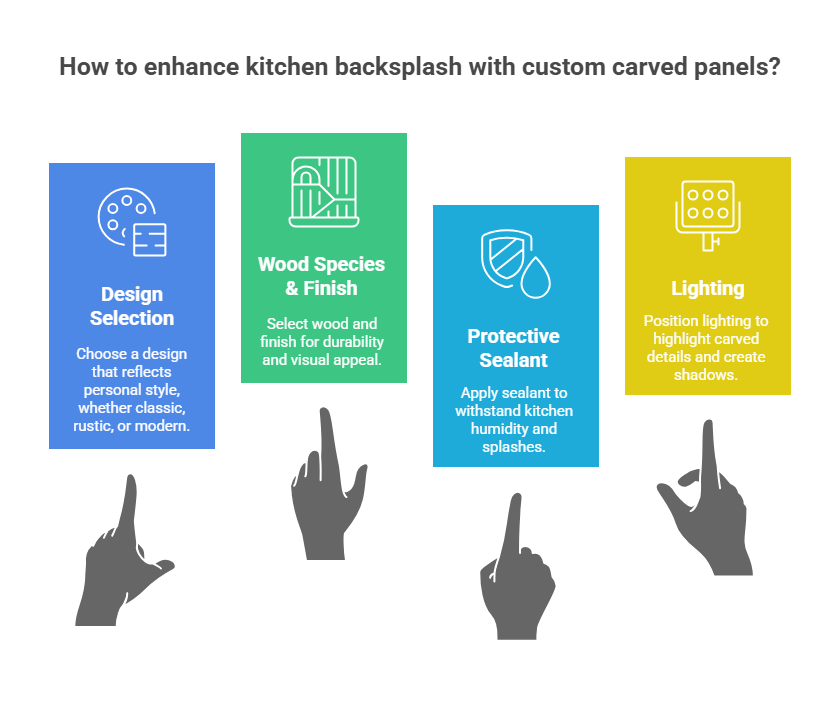 Work with a skilled woodworker or artisan who can help you pick the right wood species and finish for durability and visual appeal. Opt for panels treated with a protective sealant to withstand kitchen humidity and splashes. Position lighting to highlight the carved details and create elegant shadows. By selecting custom carved wood panels, you’ll turn your backsplash into an eye-catching focal point and elevate your kitchen’s natural warmth.