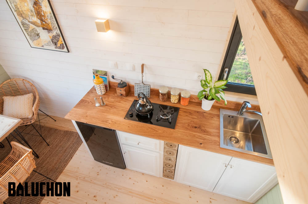 The entrance to the tiny house leads to the living room with a table for three people to eat. The kitchen is equipped with a fridge, hob, sink, and a water heater. Enough to cook good meals in a well-ventilated space.